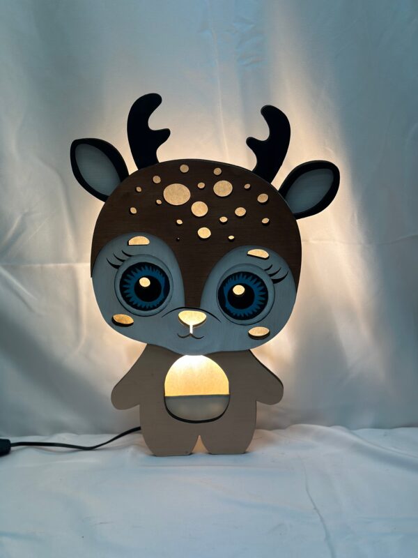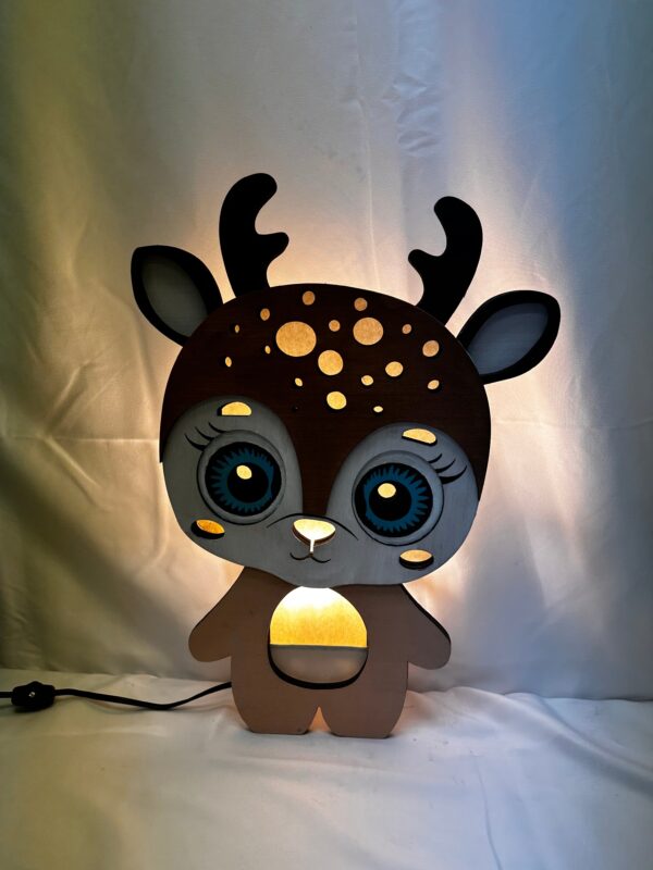 The baby deer lamp is a charming and enchanting piece of decor, perfect for both the bedroom and children’s room. Handcrafted in Nanaimo Canada, this lamp is made with three layers of carefully painted wood, adding depth and artistic flair to its design.