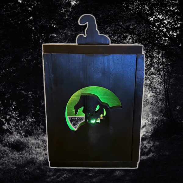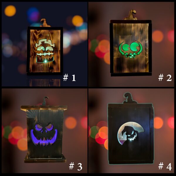 Wooden Jack-O-Lantern Halloween Lanterns are made from Pine The bottoms of the lanterns are open and can be placed over a light source of your choice. A battery-powered tealight is available as an option, (the tealight flashes to mimic a real flame)